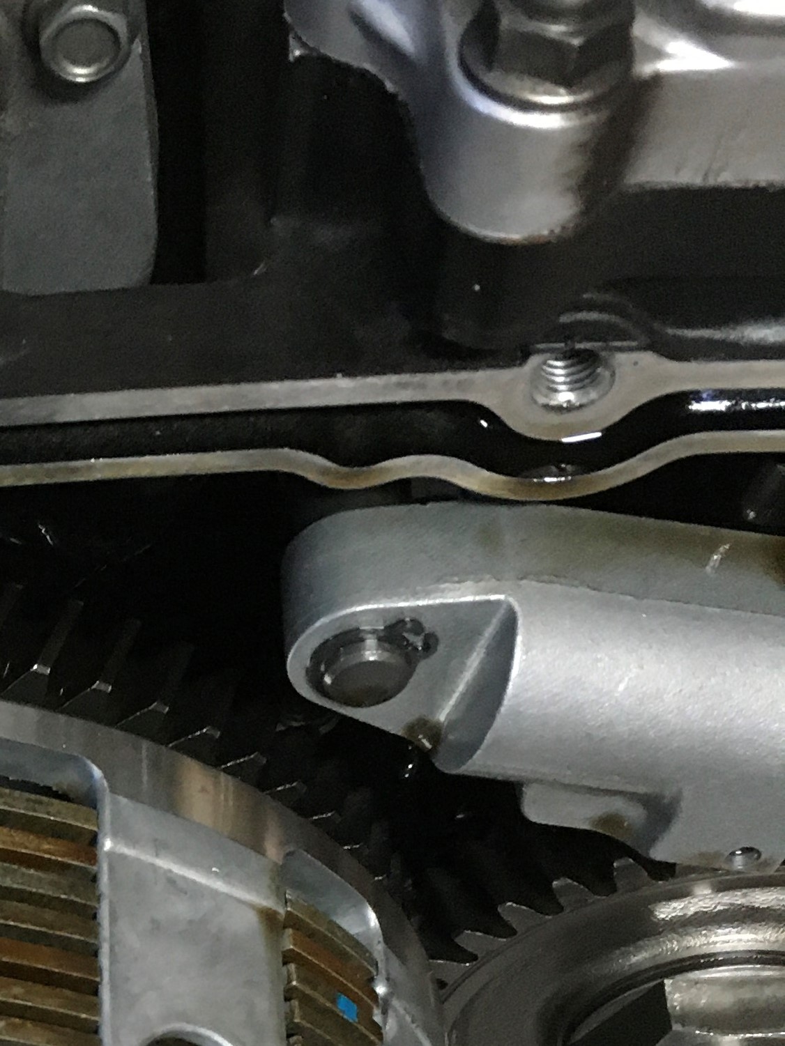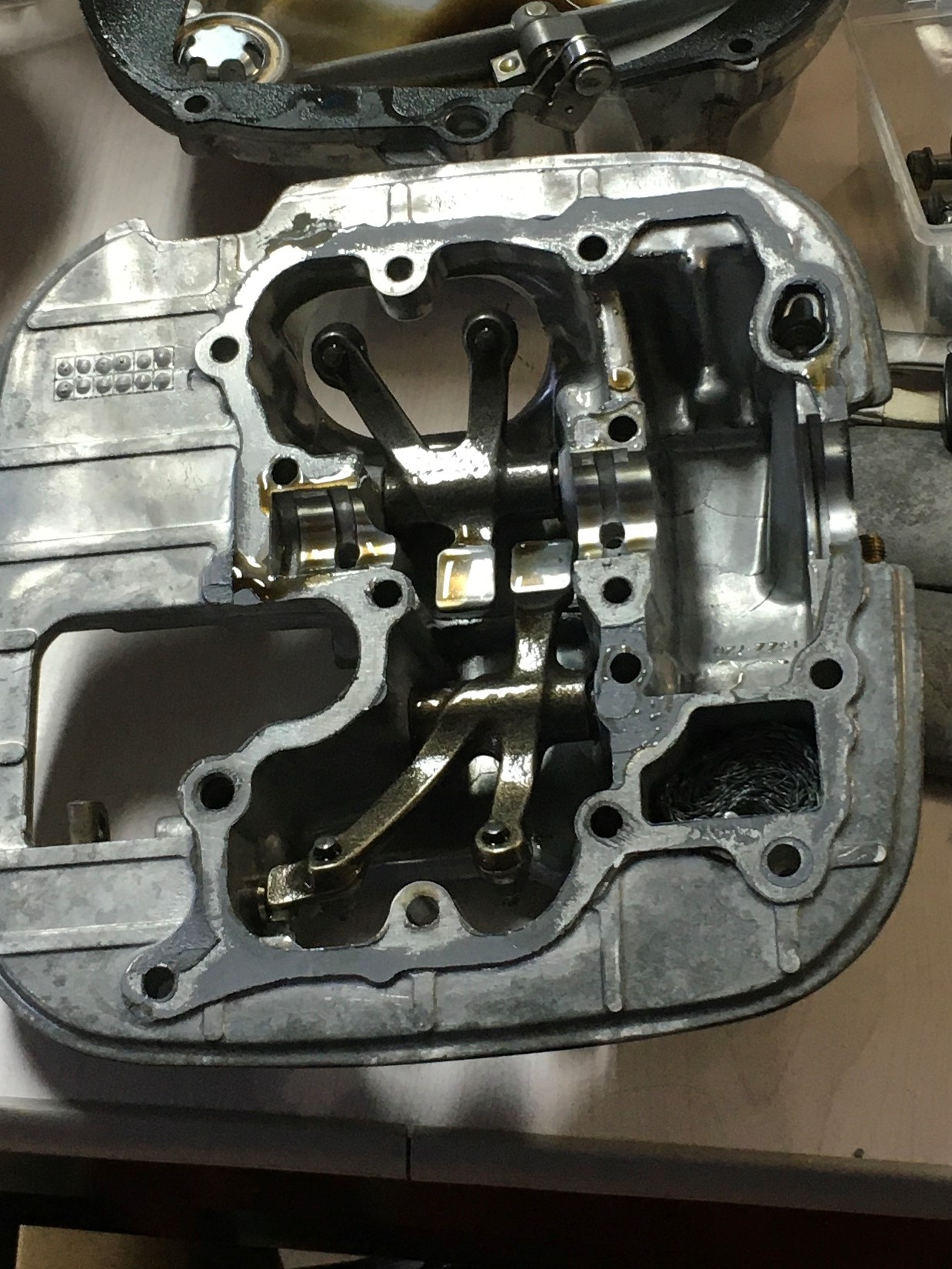 The Clymer manual and factory service manual both have nice illustrations that show exactly where all the bolts and sealing washer go. Pay attention to the illustration. If you mix up these fasteners, there’s a good chance you will either strip out the internal threads in the aluminum, or break off a bolt. Some folks make a nice big copy of that illustration and poke holes in it to accommodate each bolt. It helps to keep track of things.