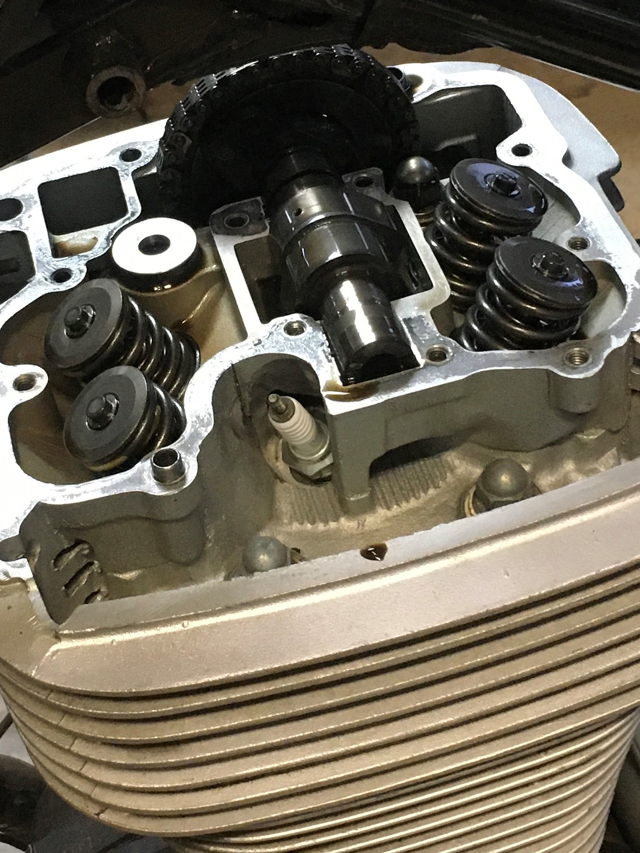 Now you can see the cam. Note the position of the cam lobes. They point down into the reservoir full of oil. I refer to that reservoir as the “trough”. When the head cover goes back on, this is ho the cam lobes must be oriented, facing down into the trough.
