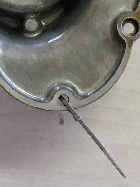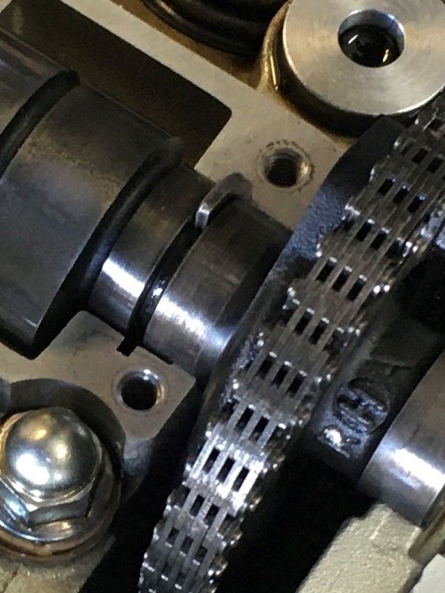 Now the cam can be shifted to the left. Slip the sprocket and chain to the right and pull out the cam. Watch out for the drive pin, don’t lose it.