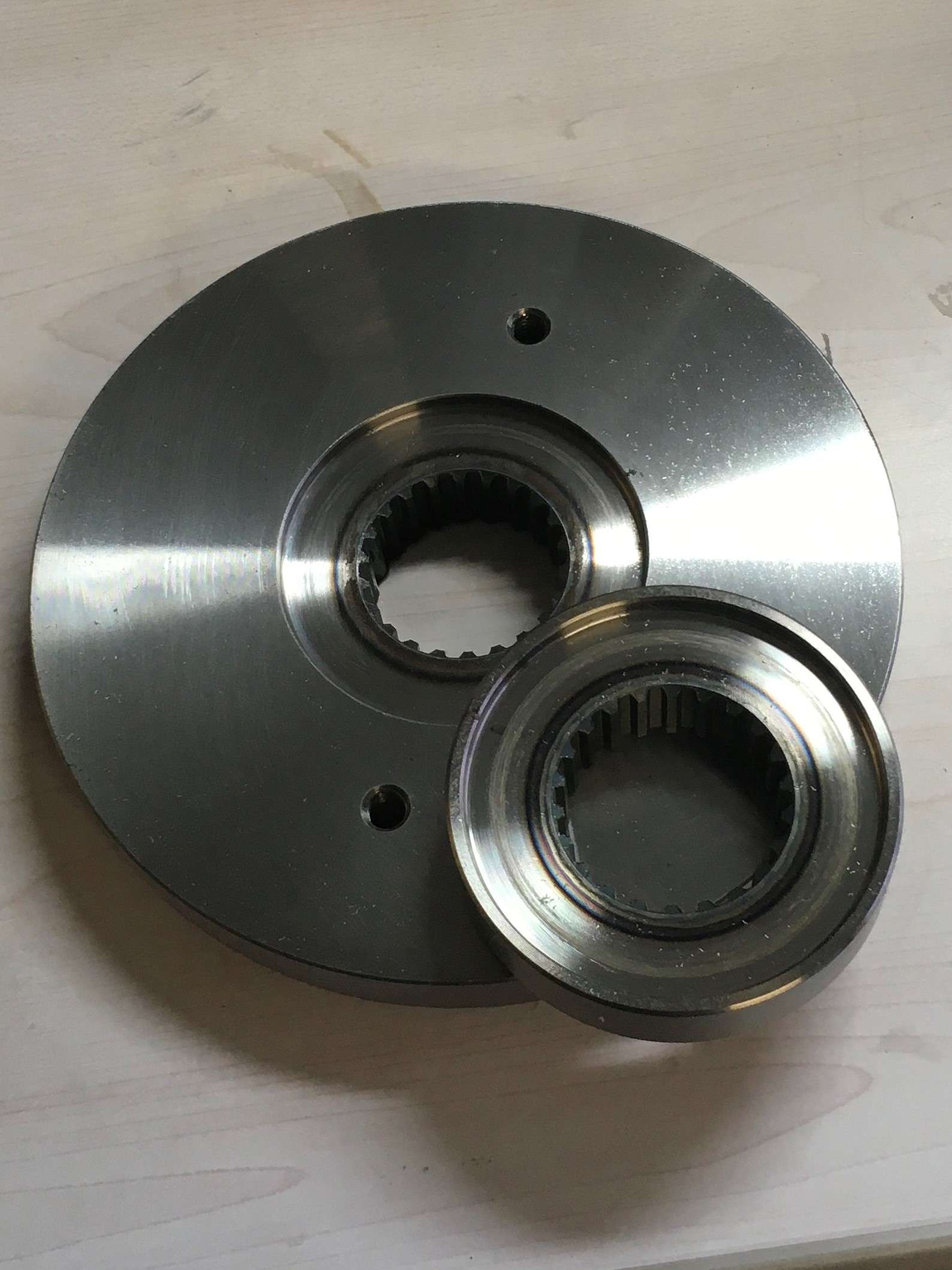 To get your hands on one of these, you need a lathe, or you must pay someone to machine off the excess material.  Take the O.D. down to 3.000”, maintain concentricity within .001” TIR.  Here you see the difference between the 6.5” flywheel and the 3” flywheel.