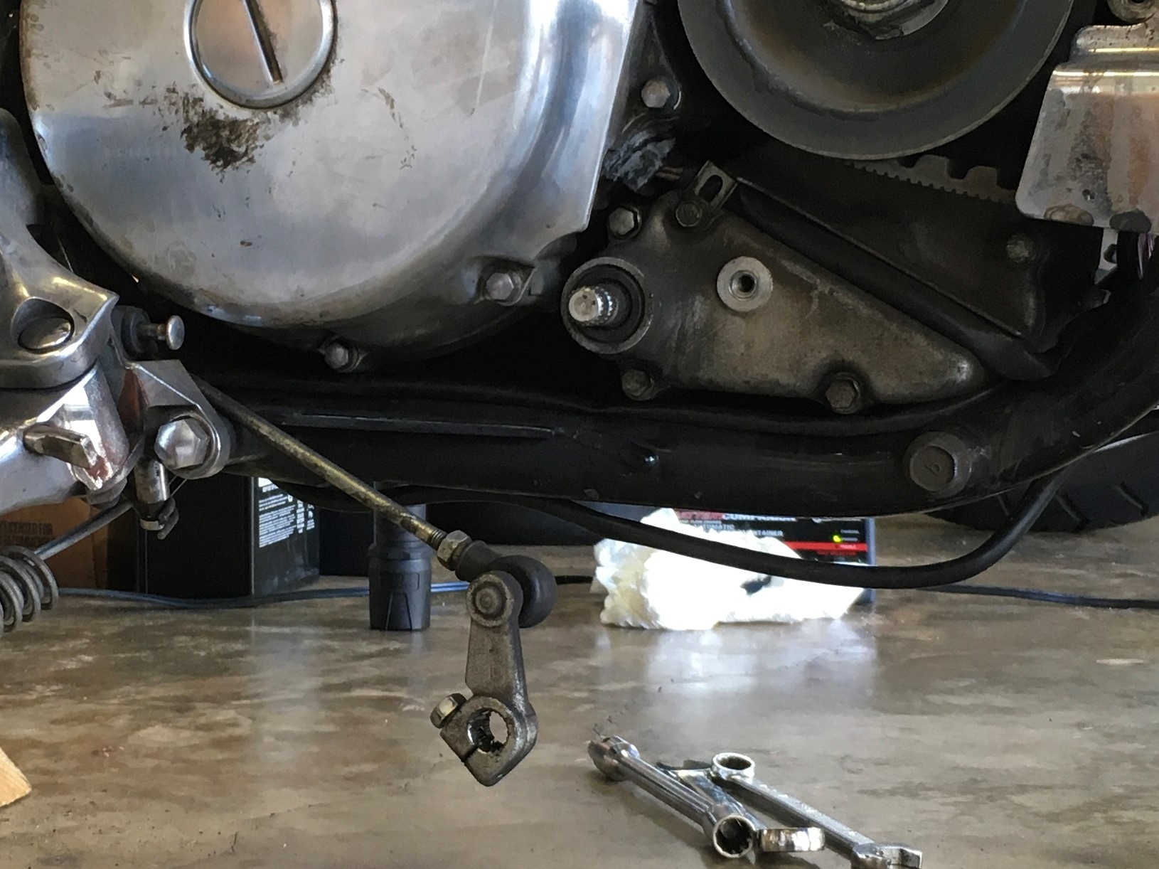 The left side footrest assembly must be moved out of the way.  Since the side-stand switch is attached you need to free up the wires to the switch.  If you don’t free up the wires, you may damage the switch when you try to move the footrest.  Remove any zip ties that restrain the wires running along the left side frame rail.