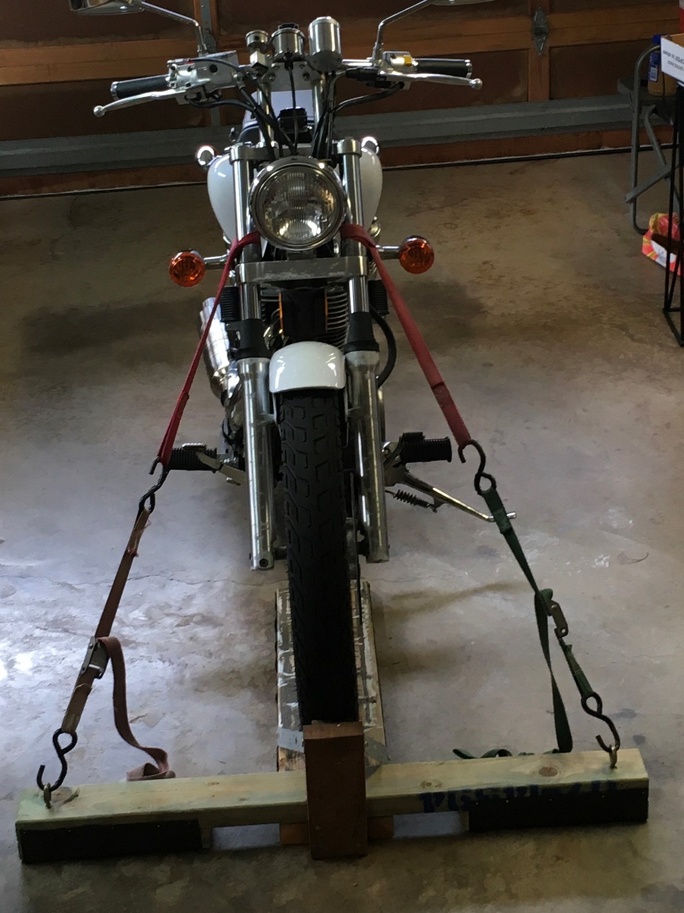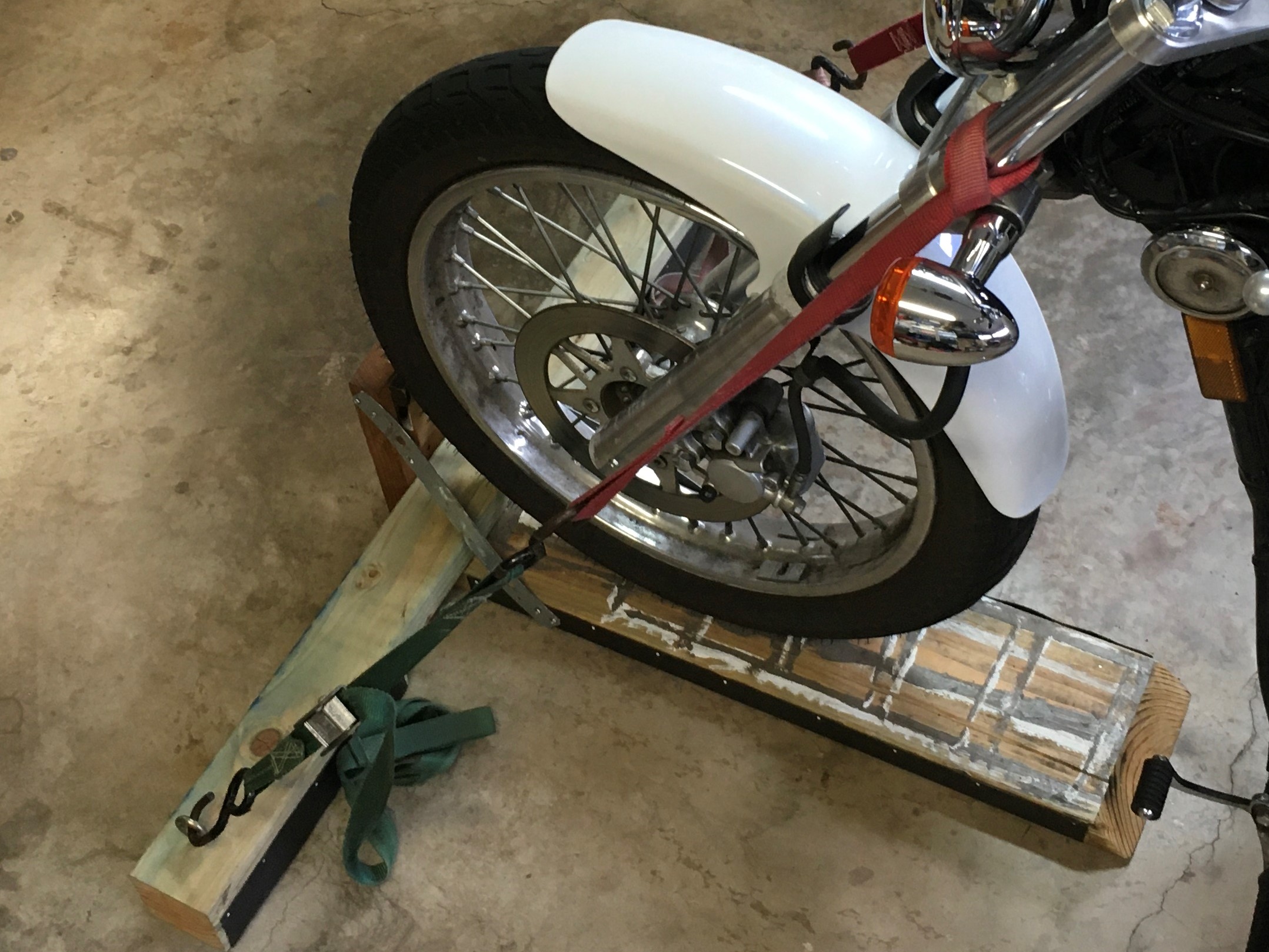 There’s not much to it.  Just a few chunks of scrap lumber.  It’s versatile.  Allows working on the bike without fear of dumping the whole shitteree on it’s side.