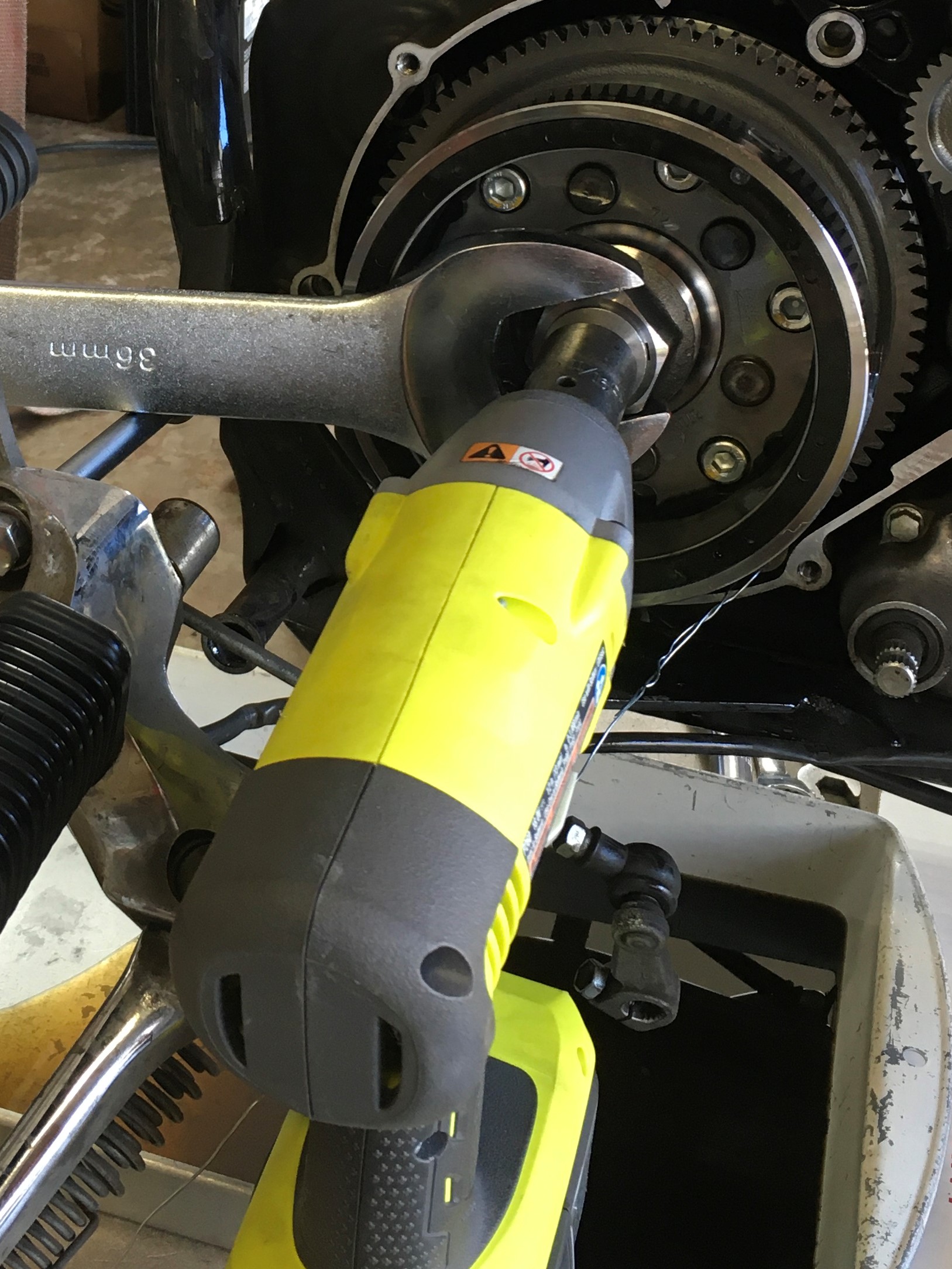 Loosen the alternator rotor bolt.  Hold the rotor with the 36mm wrench and loosen the bolt using a 17mm socket.  I use an impact gun.  Some experts advise against the rattle wrench.  Seems there is concern about damaging the magnets in the rotor.  I have never experienced a problem, but who knows.  You’ll have to decide on your own which tool is best.  The bolt must remain in the crankshaft, don’t remove it completely.  Just back it off several turns so that there is at least a ¼” gap between the rotor and the bolt flange.