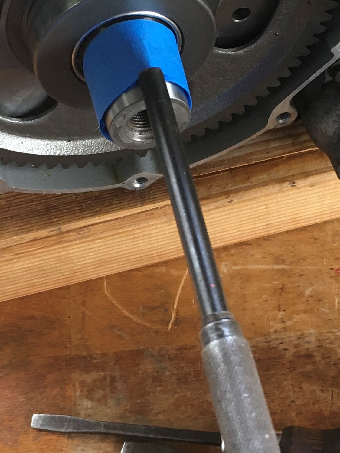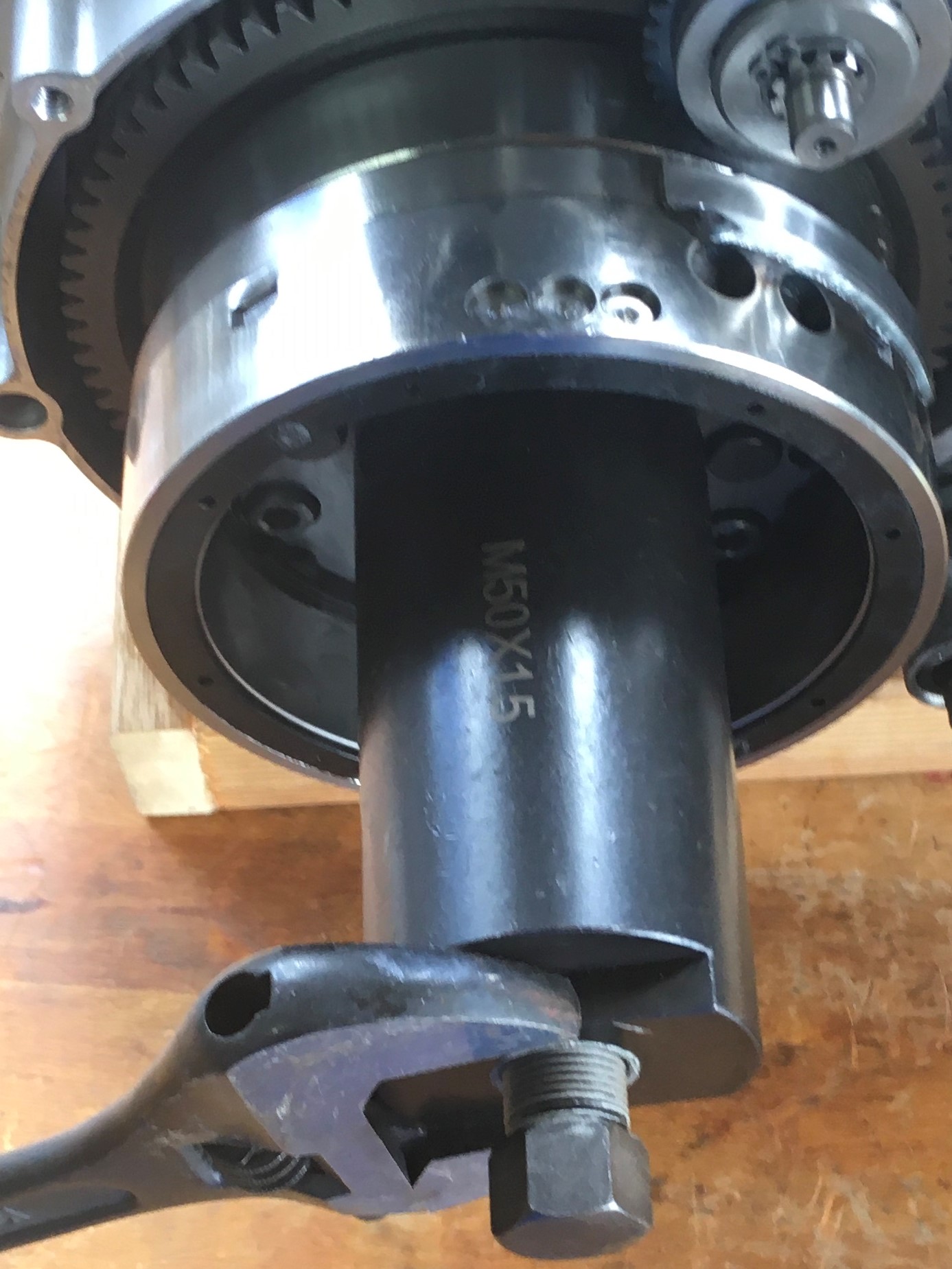 Remove the stock 6.5” flywheel and install the 3” flywheel.  There are no threaded holes in the small flywheel.  You can tighten the flywheel nut using an impact wrench.  That will probably be sufficient, but I prefer to torque the nut to the prescribed value (about 105 ft-lbs).  That requires holding the flywheel.  The special clamp tool comes in handy.