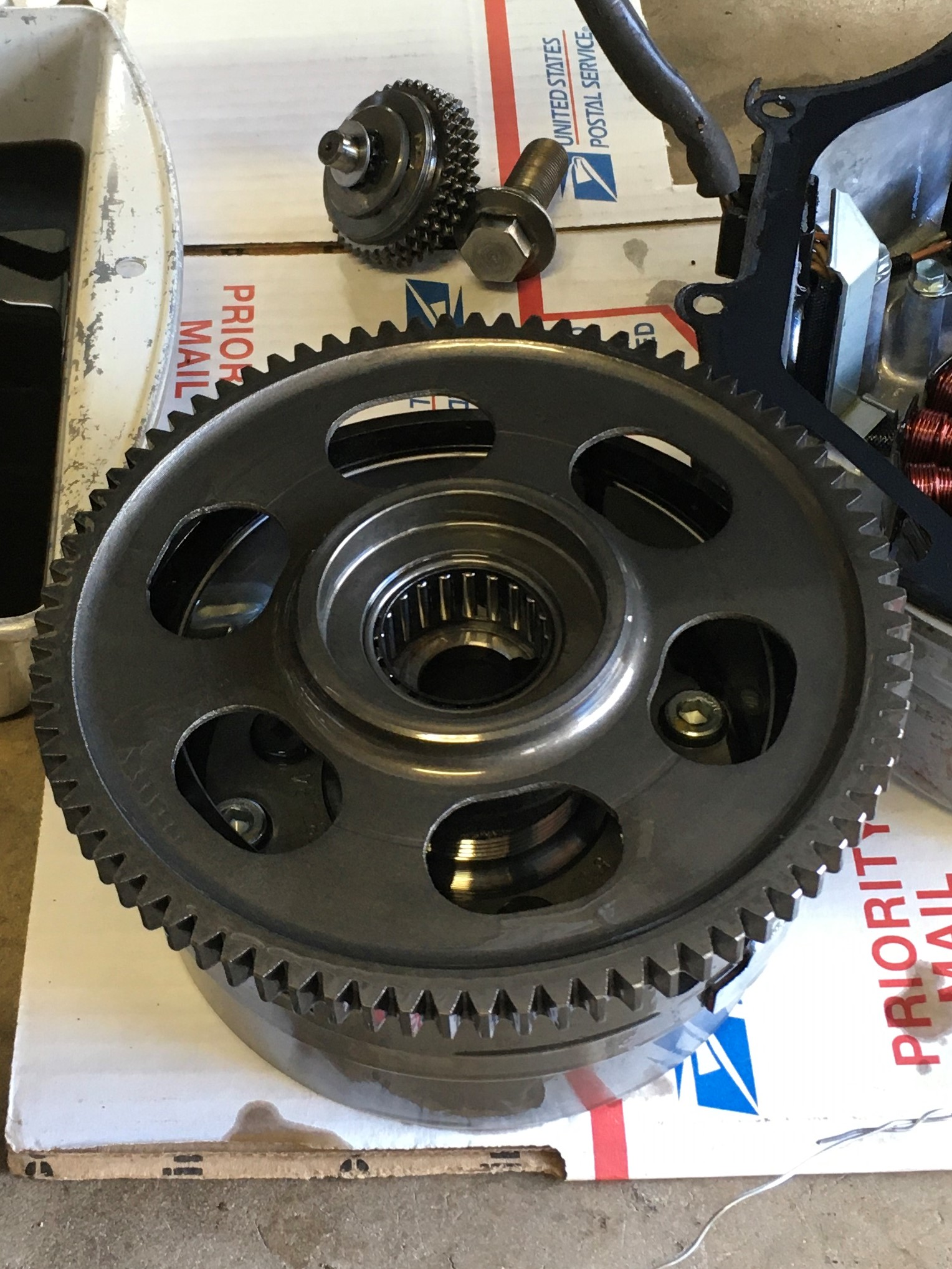 Ready for reassembly.  The new flywheel doesn’t take up much room.