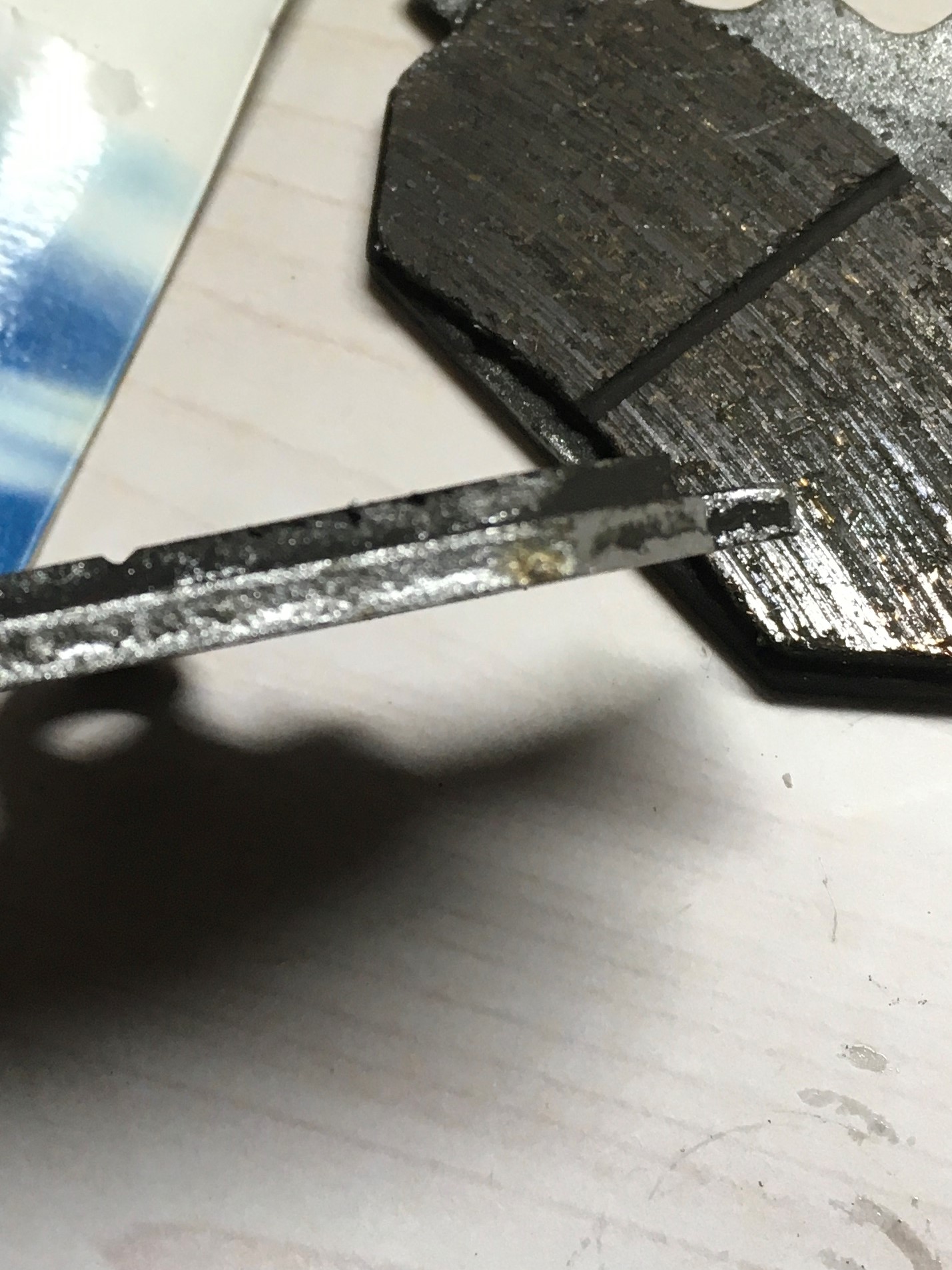 Here you see the first set of front brake pads that I changed.  They only had 4600 miles on them.  The friction material is LG (long gone).  I suspect that I did the small flywheel mod (6/14/18) sometime very close to when I changed these brake pads.