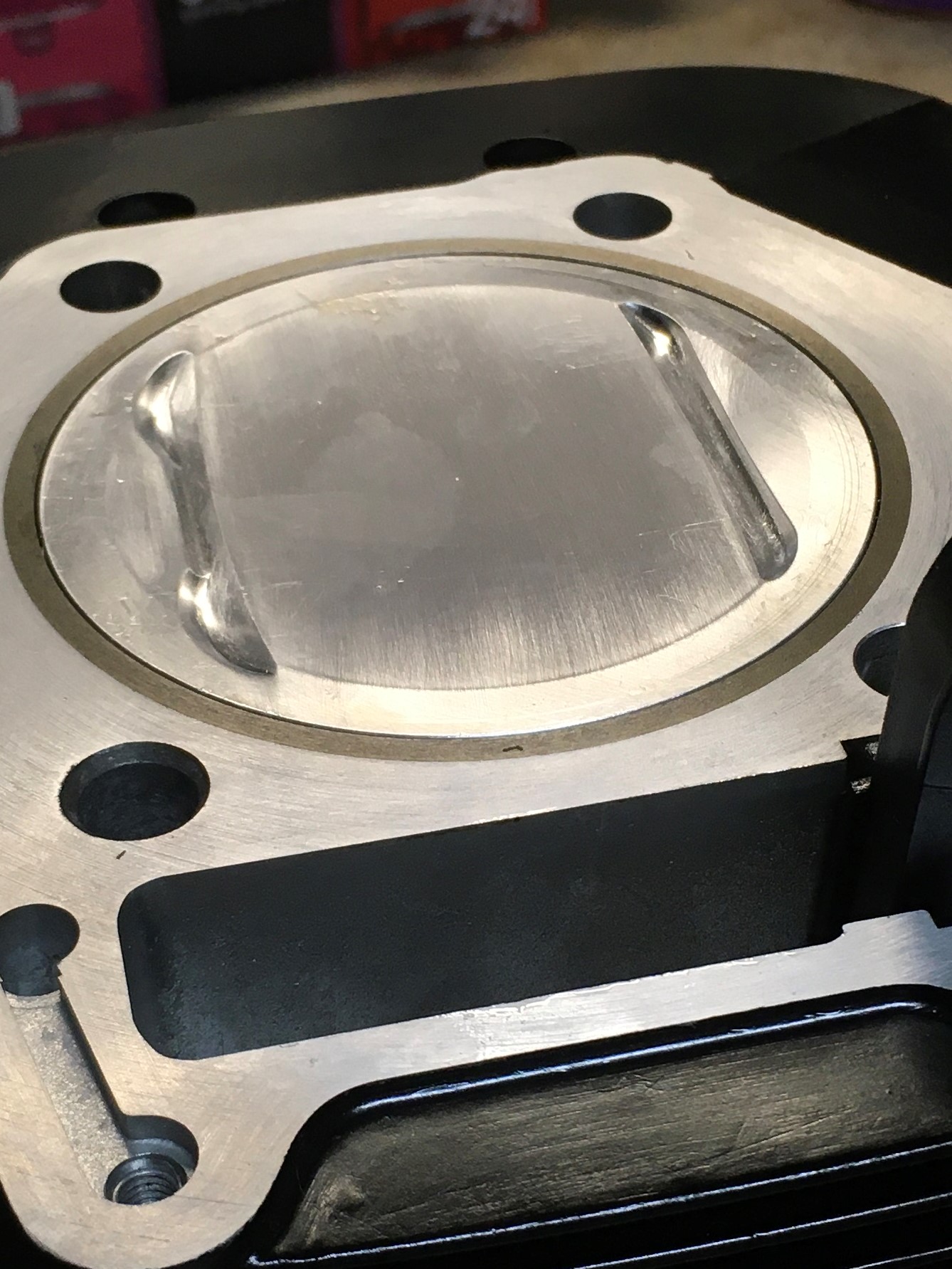 We’re gonna see if the old Twin-Swirl Combustion Chamber (TSCC) can hack a CR over 11:1.  Up to this point, it has handled increased compression well.  The centrally located spark plug and turbulent combustion chamber handle pump gasoline quite well.  Adding the tight quench associated with the Wiseo flat-top also helps to stir things up.  At 10.4:1, the 94mm flat-top engine ran fine on 92 octane.  No problems with detonation.  Now we’ll see what happens with more displacement and a little more compression.