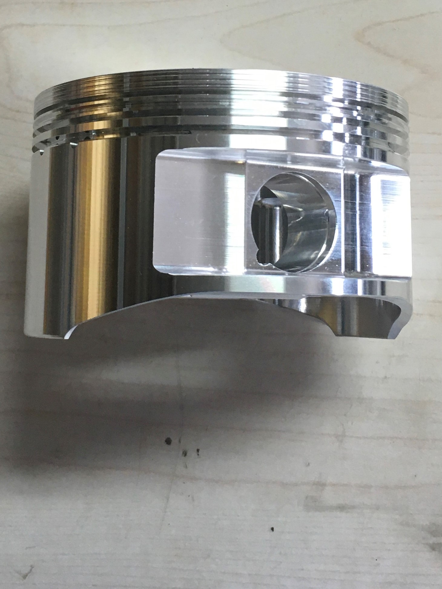The compression height on the flat-top is significantly taller.  At TDC it is flush with the top of the cylinder and will permit setups with a tight quench zone (.030” - .060”).   Instead of a raised top that sticks up above the basic top of the piston, it has a spherical dish that extends down into the basic top of the piston.  Like the pop-top, it increases displacement with a 3mm increase in bore size.