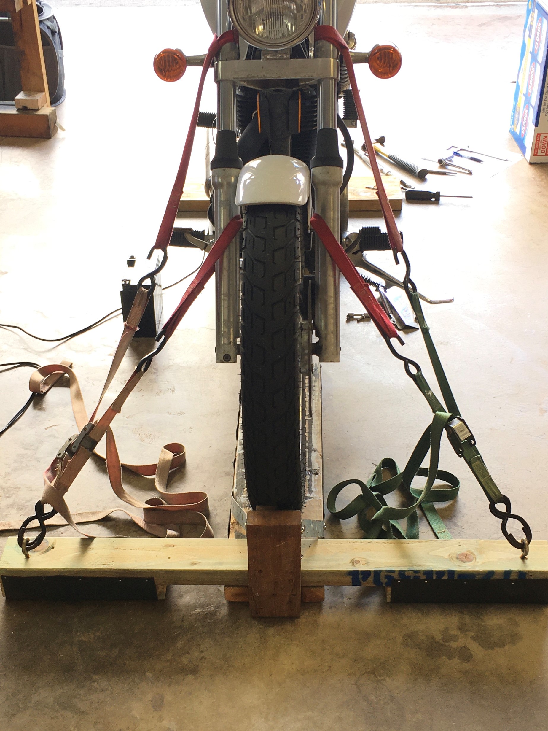 The bike has to be held upright for the sag measurements.  I use this simple wooden stand.  The straps going above the turn signals are loose so as to not compress the forks at all.  They are just there as a safety precaution, so I don’t dump the thing on it’s side.  The straps going to the area around the fender mounts are actually holding the bike upright.
