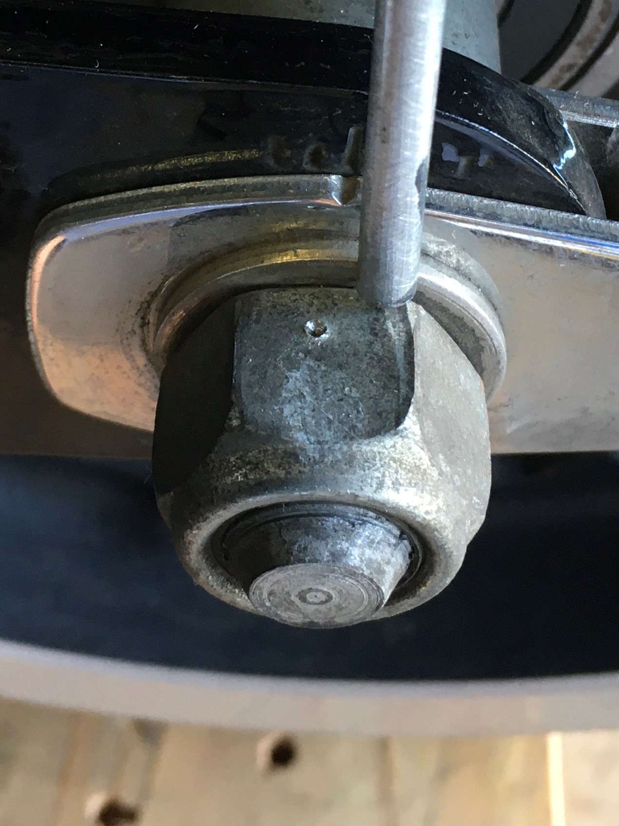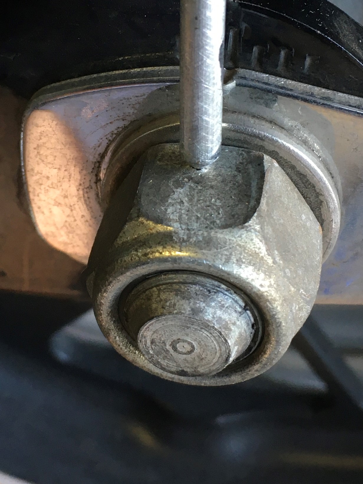 File a point on the end of the rod.  Make a punch mark in a flat on the axle nut.