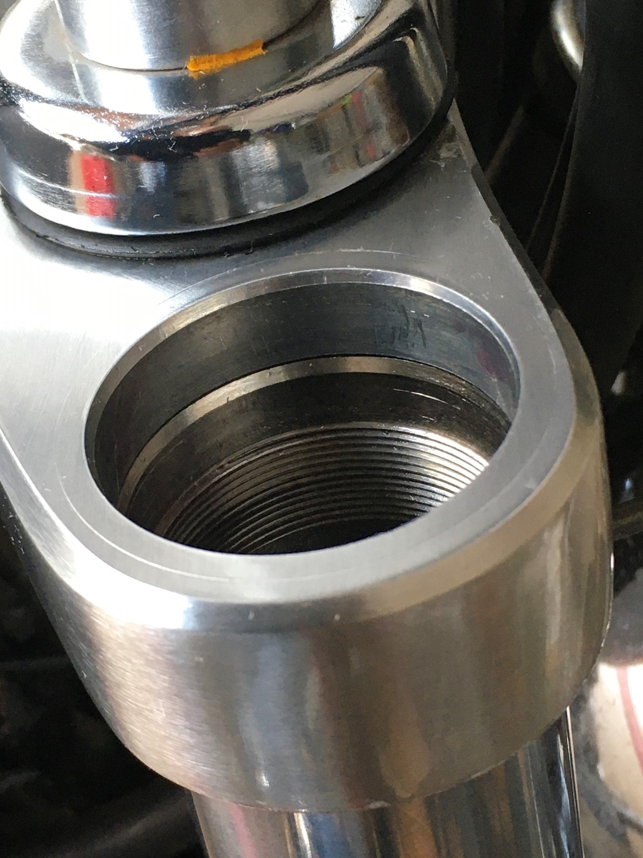There’s a step in the top triple tree, so if you are checking oil level with the forks on the motorcycle, you have to subtract 10mm from your readings.  For instance, if you measure the level at 120mm, its actually 110mm due to the step.  It’s also important to keep the dipstick centered in the fork tube.