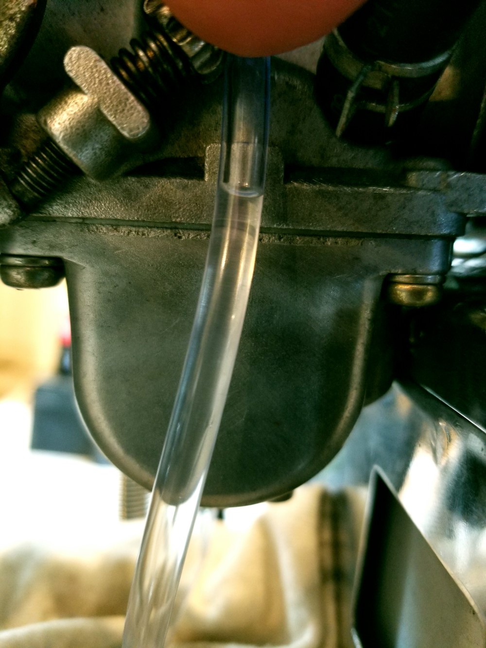 5. Observe fuel level in airline (I used my finger to push the line to be very close and parallel up the side of the carb)