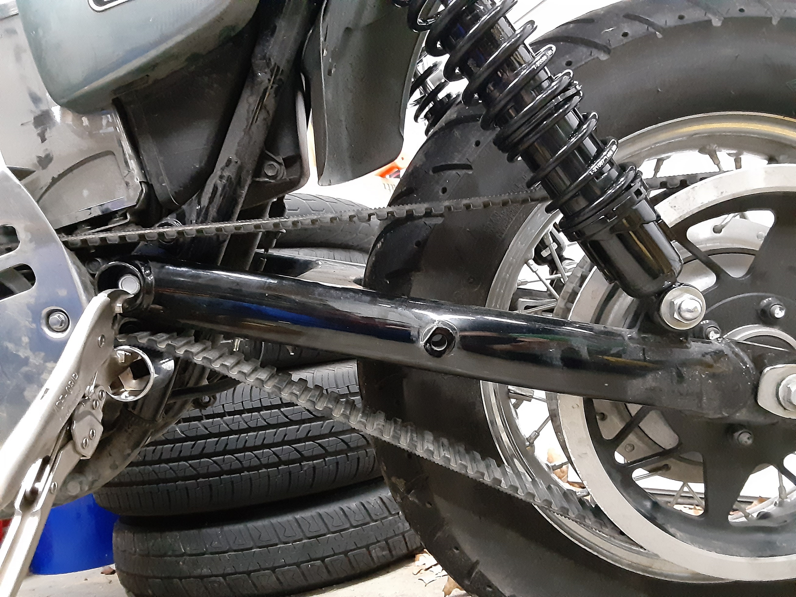 I checked the tension of the full swing-arm range with the suspension removed and the concept seems to work. I'd fabricate it with an idler pulley suspended from the swing-arm bolt.
