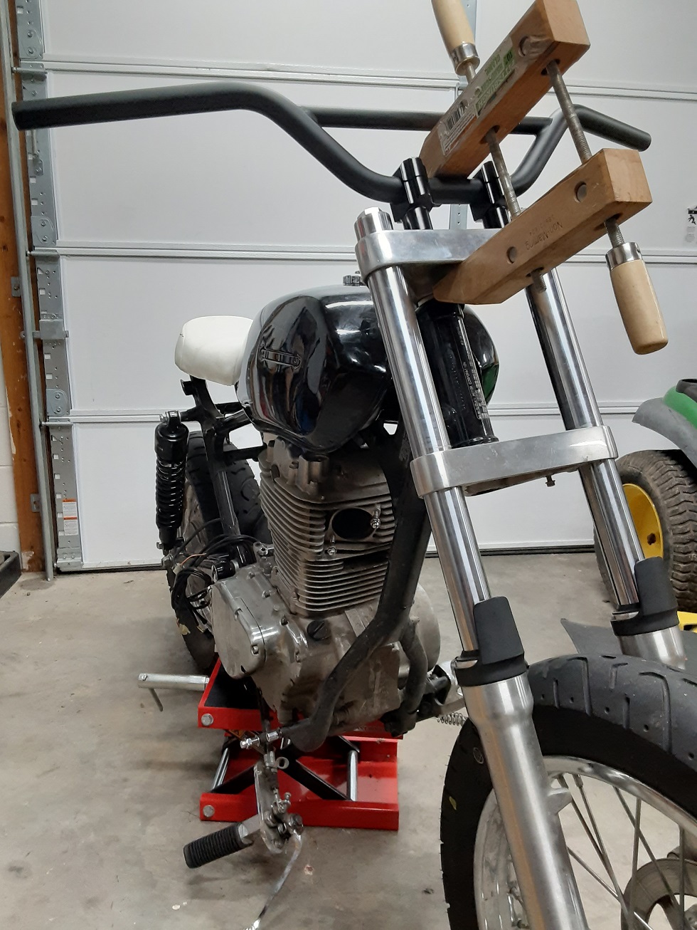 The top triple clamp has been roughed out with a burr and will be finished during final fitting. The 4in1 brand 3.4 gallon E-bay tank fits well with plenty of clearance under the bars with 4 inches of rise and 2 inch mounts. I will be cutting the seat narrower and bending the sub-frame once I finish the backing plates for the mid mount controls.