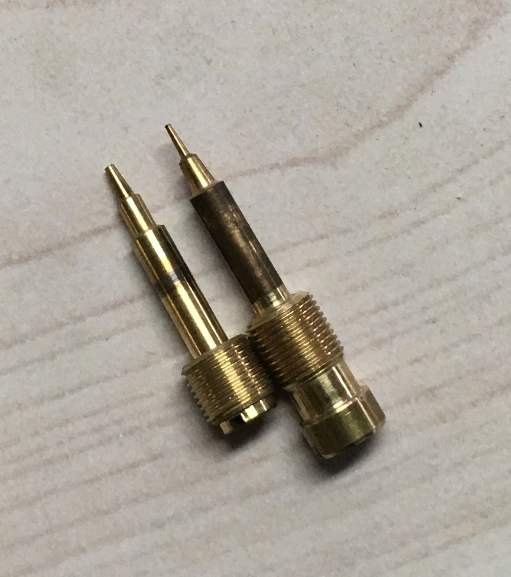 Not only is the kit screw a lot longer, it also has a different size tapered needle tip, and the straight shank portion where the o-ring normally rides is not straight.  So, the needle tip isn’t gonna throttle fuel because its only half the diameter of the OEM needle tip, and the o-ring won’t seal the shaft properly.  It’s complete junk, totally no good, unsuitable for this application.  Check out this close-up of the needle tips.  Good on top, bad on bottom.