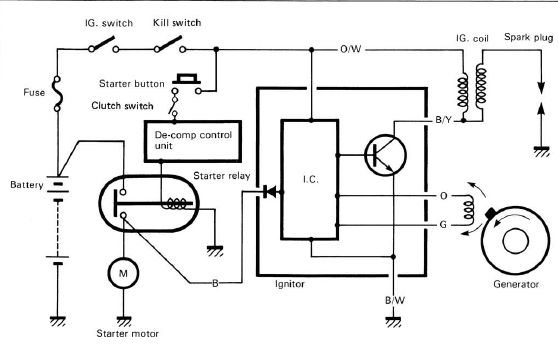 I have replaced the stator, pick-up coil, reg/rect., starter solenoid, ignition coil, decomp solenoid, decomp controller, ignition switch, starter button and all the wire between. All that is left is the CDI.
