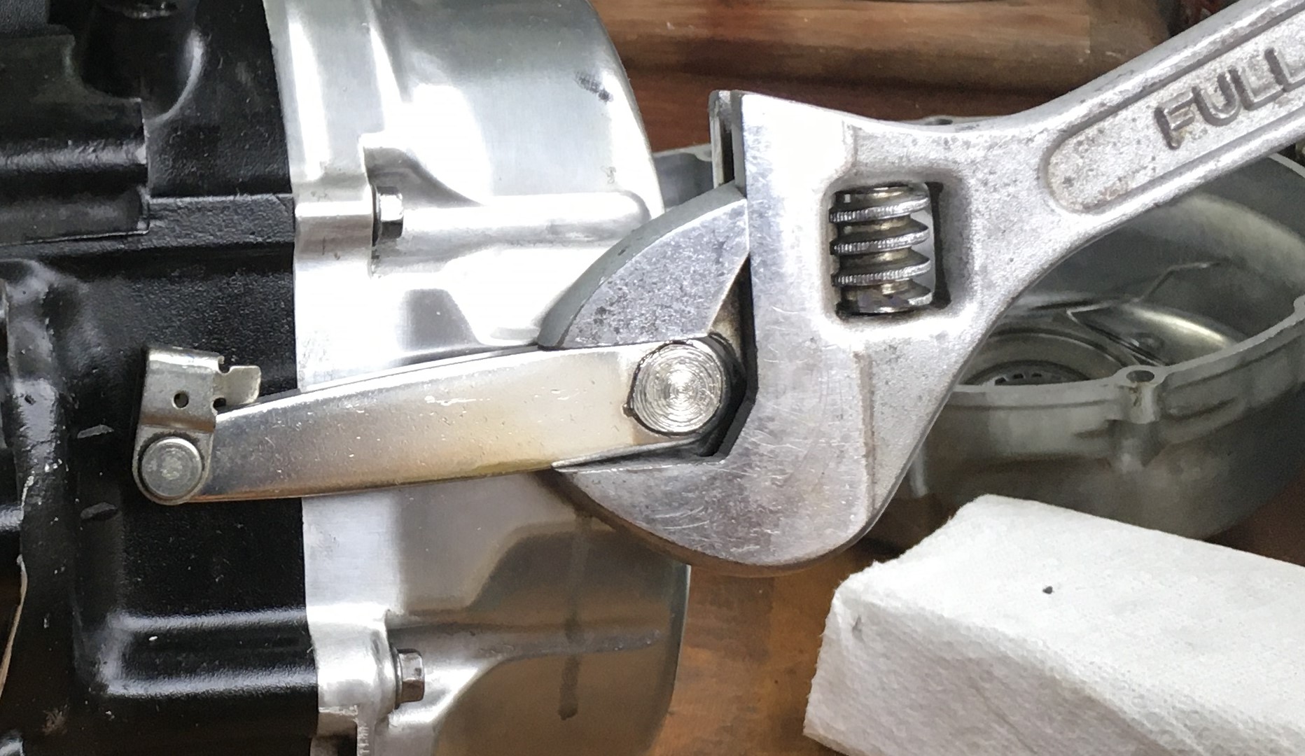 When things are just right, the release arm will look like this. It will be centered between the two marks on the case when all the free play is taken up. Just let the weight of a large crescent wrench take up all the slack in the release mechanism. Don't push on the wrench, just let the weight of the wrench take up the free play.