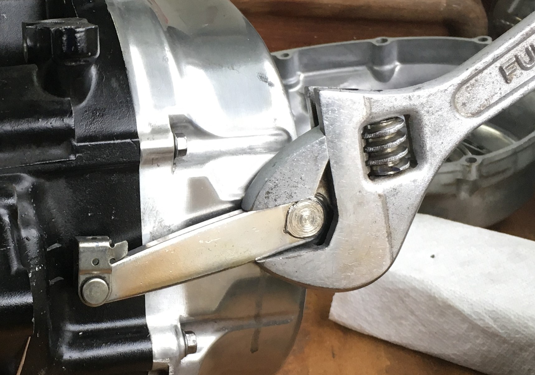 When the pushrod is too short, the position of the release arm looks like this. It would be expected if a new set of clutch plates were just installed. If your release arm looks like this when the longest pushrod (46.5 mm) is installed, something isn't right. Don't just make a longer pushrod, figure out what's wrong.