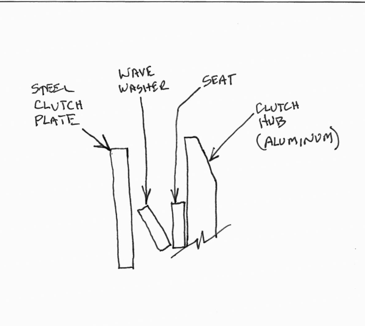 A picture is worth a thousand words. The wave washer is installed so that the edge of the outside diameter bears against the steel clutch plate, and the edge of the inside diameter bears against the seat. The seat goes between the aluminum clutch hub and the wave washer. My crude sketch does not show the fiber plate that is sandwiched between the clutch hub and the steel clutch plate. That fiber plate surrounds the wave washer and seat.