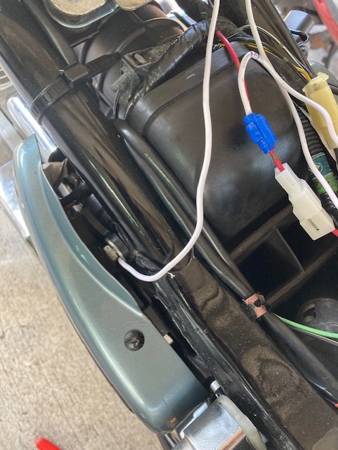 Wheelbender, is the white wire going to the bolt your ground for the outlet?  If so, that is a very poor location for a ground wire.  The bolt holds your plastic airbox to the frame.  The wire is pinched between the bolthead and the washer.  The washer contacts the plastic tab.  That's a terrible ground.  You need to secure the ground wire up hard against bare metal on the frame or engine.  Remove any paint so the wire is hard against the clean, bare metal.
