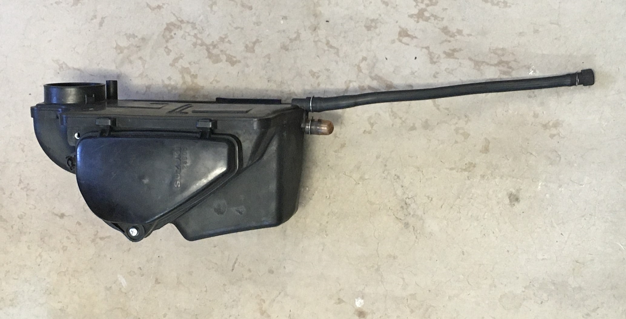 The oil-in-the-air problem is evident on the stock airbox.  With the stock paper filter and the super-restrictive airbox, it’s not uncommon to find oil accumulation.  That’s why it has the drain tube & plug.  You have to periodically dump the sludge out.