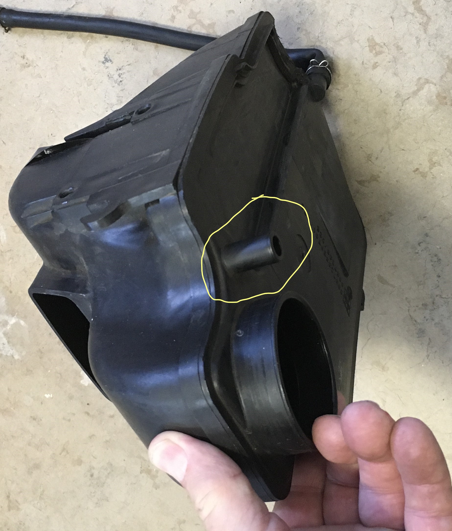 This is the crankcase breather nipple on the stock airbox.  It also is located between the filter element and the carburetor.  I have never measured it, but I assume that on the stock airbox, the area between the filter element and the carburetor develops quite a bit of vacuum.  The contraption is just so restrictive that I don’t see any way that it wouldn’t suck like the dickens.  While it may get the job done as far as the environment is concerned, it works lousy if you are lookin for performance.
