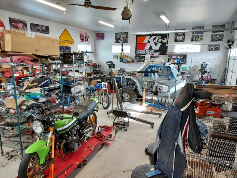 No shortage of work in the Busted Knuckle Garage!  I see two out of three vehicles without an engine.  That is a problem.  At least there is a finished long block hanging from the engine hoist!  I got it at IKEA - some assembly required...