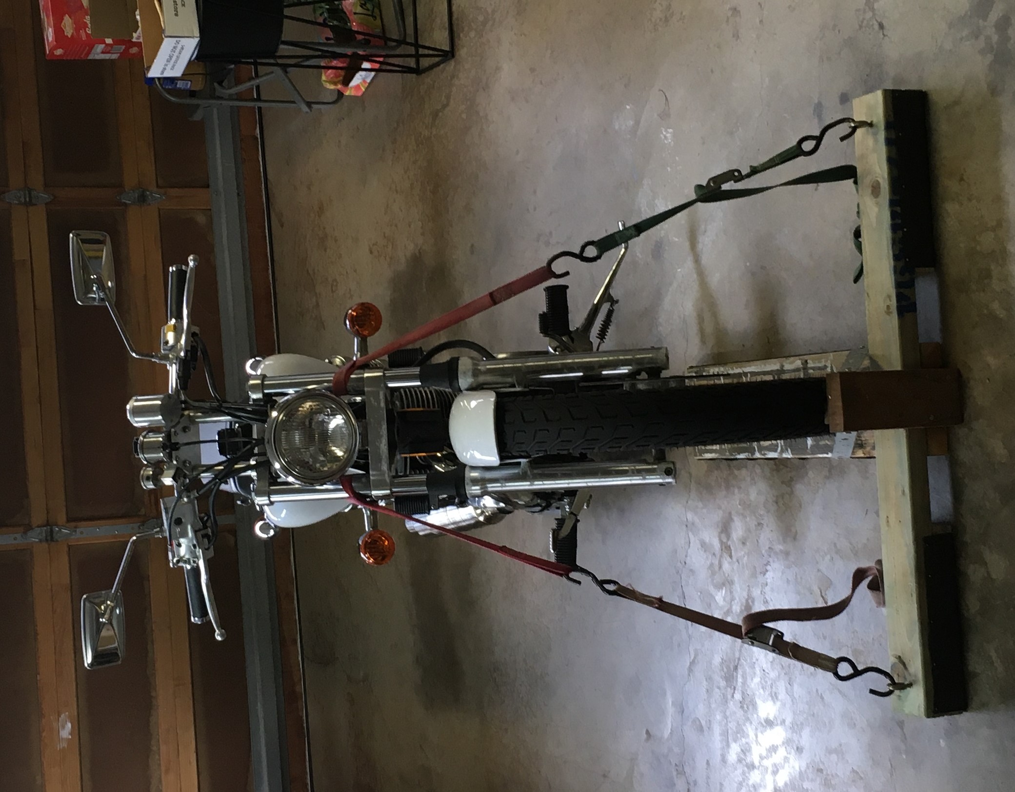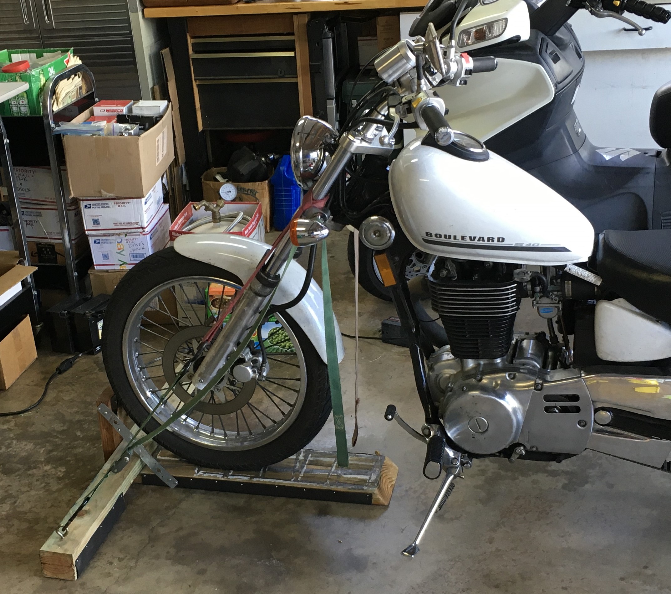I agree Versy, you don't want to tip the bike over.  I never have liked putting a block of wood under the kickstand.  That's why I always park my jalopy on this simple stand constructed from scrap lumber.  The tie downs permit accurate leveling of the bike. It works good, is safe, and was essentially free.  Makes my life a whole bunch easier.