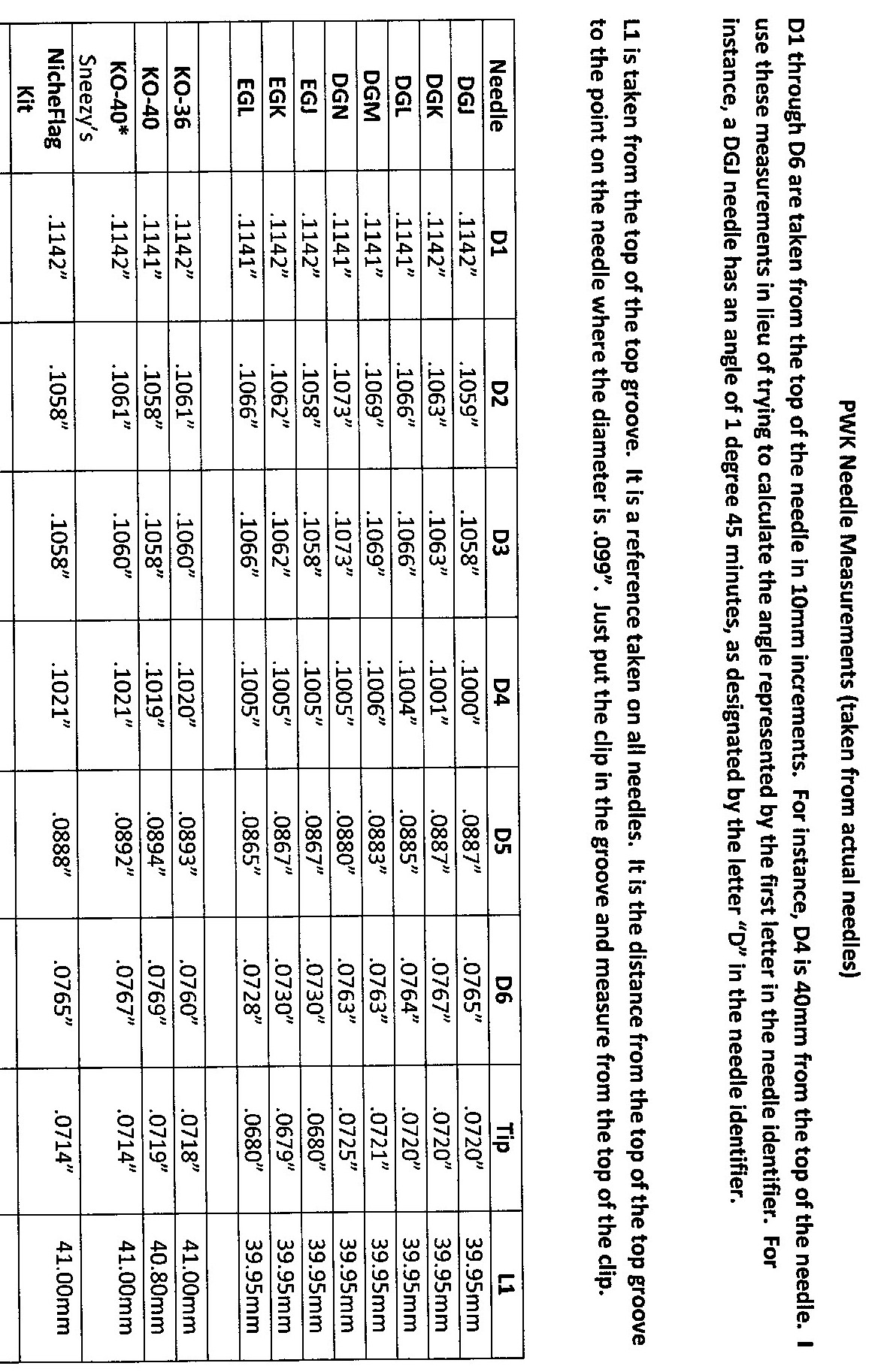 I do have the ability to accurately measure slide needles. This table provides measurements taken off the actual needles. The needles labeled with three letters (DGK, EGK, etc.) are genuine Keihin needles. The other needles came from knock-off repair kits or knock-off carbs. You may find the table useful. As noted in this report, I had good results with a DGK combined with a .075” air bleed and a #140 to #145 main jet, but the needle was controlling WOT mixture. I had superb results with an EGK combined with a .032” air bleed and a #135 main jet.