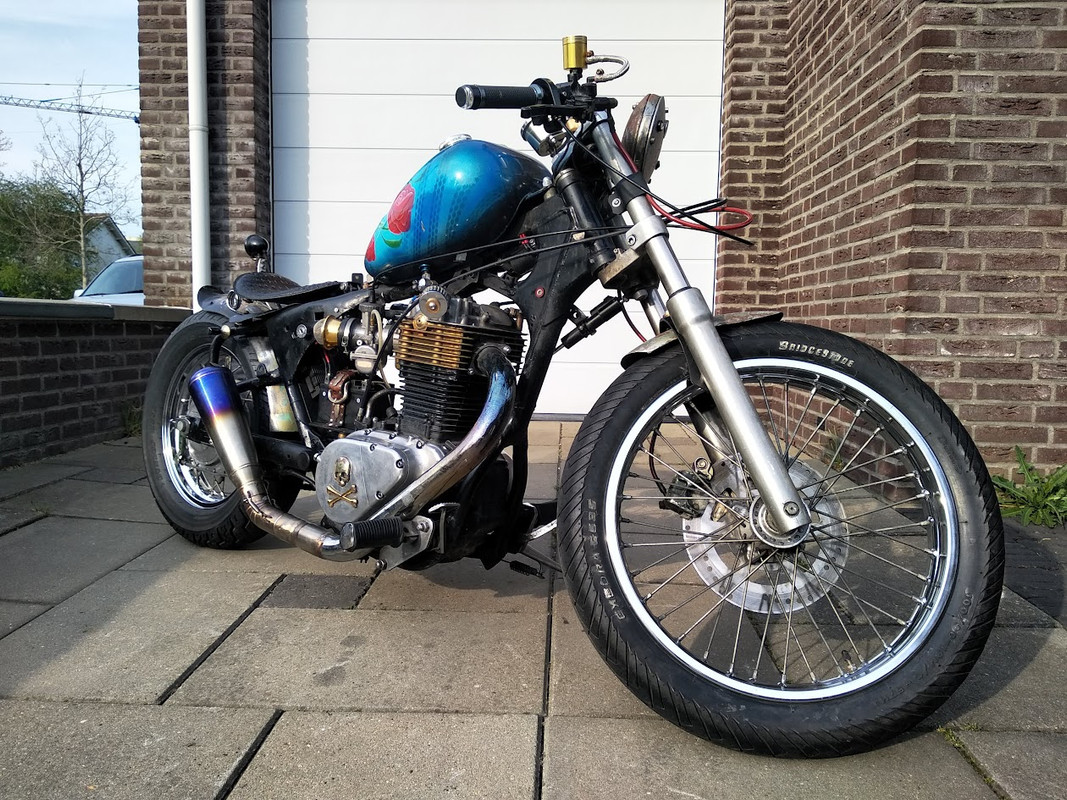 1995 Savage bought years ago for $800. Slugged forks 2" to lower front end, cut out 11 degrees of rake at the neck and rewelded, clip on bars, new tires F&R, custom removable tank cover for track racing, added custom fins to cylinder head, removed 70 pounds down to 282 pounds with a half full tank, seat and rear fairing, LiPo battery of 1/2 pound, Custom flat box muffler under frame/engine, reworked tail light and license carrier, added mini tachometer, discarded 4 pounds of kick stand and made one under 1/2 pound and no engine modifications. Wheelbase now 53 inches and the bike turns on a dime. Videos maybe next week if I manage to get it to start nicely (it was perfect a year ago) and stay running.