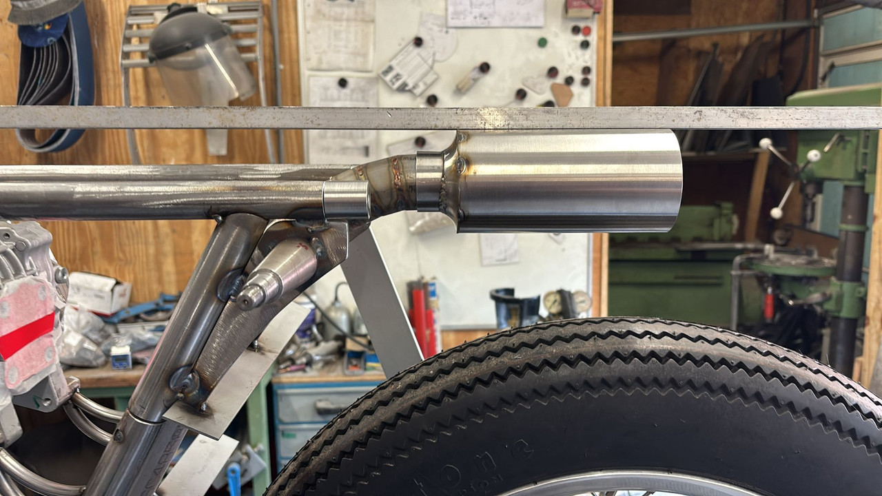 The plates will be slotted into the bushings and welded in. The whole silencer assembly will be able to slot in and out of the frame for (dis)assembly.